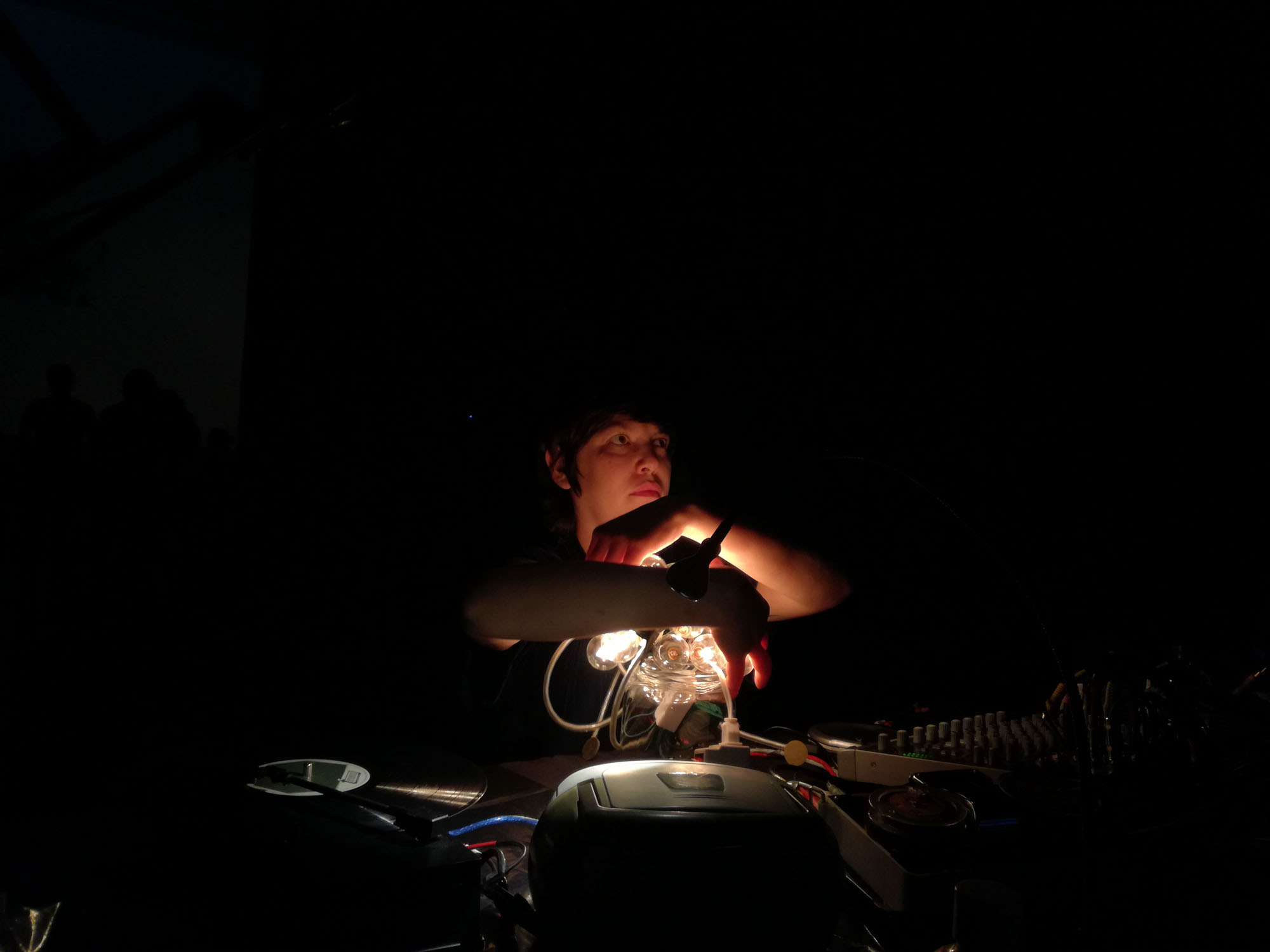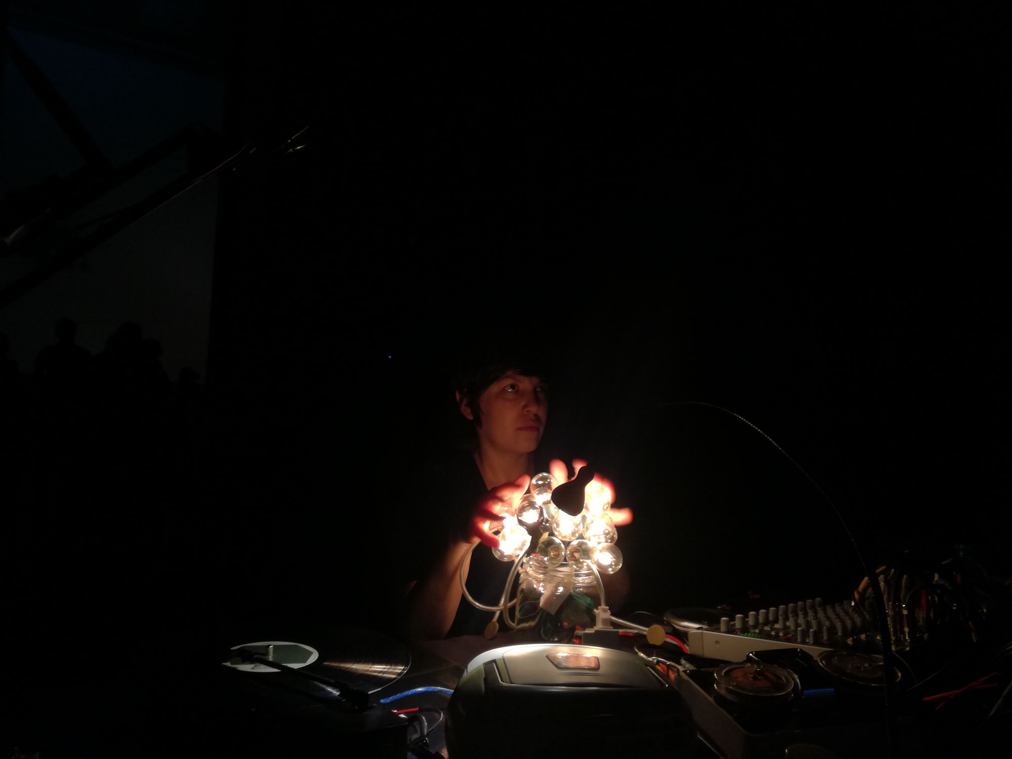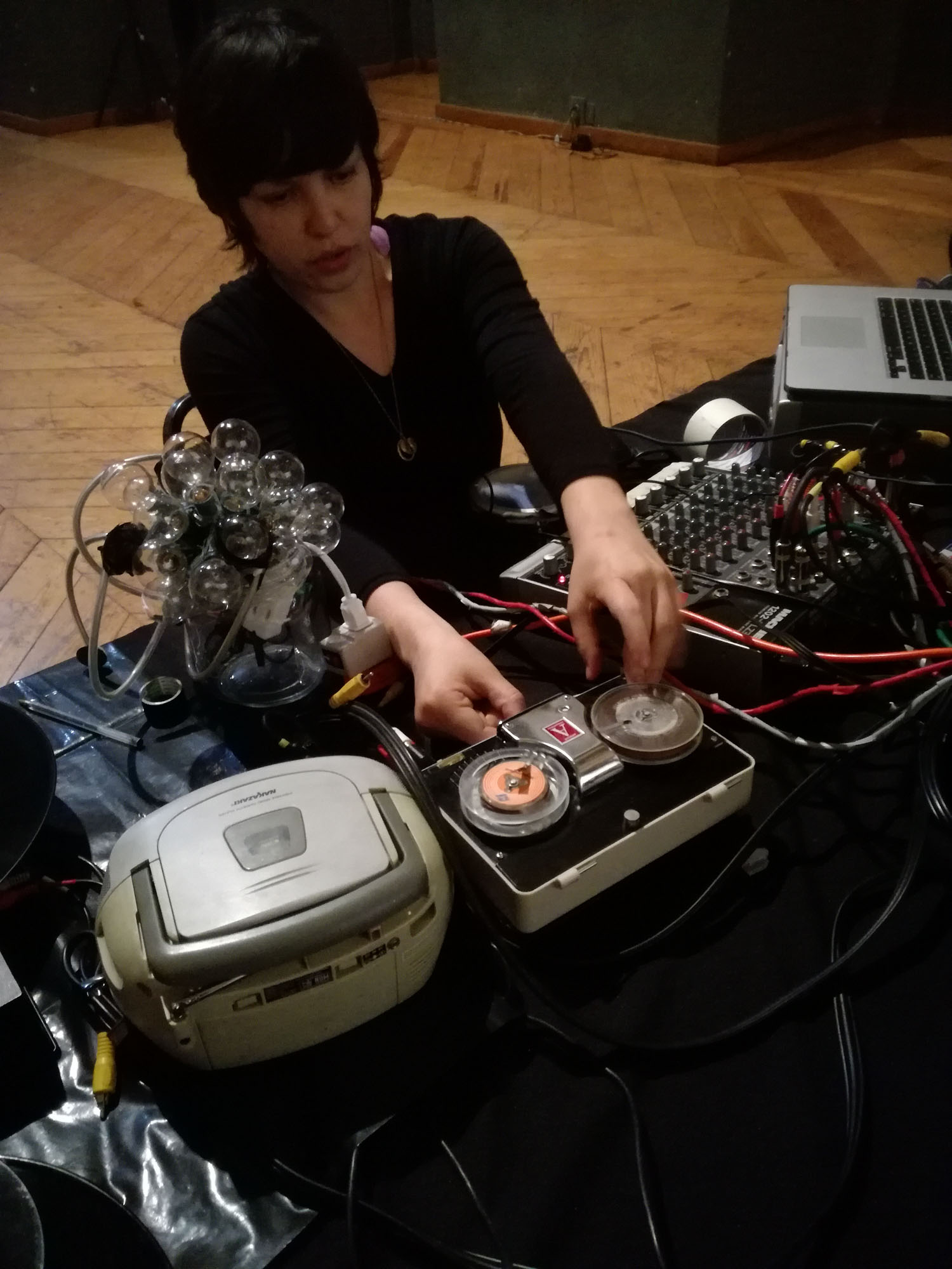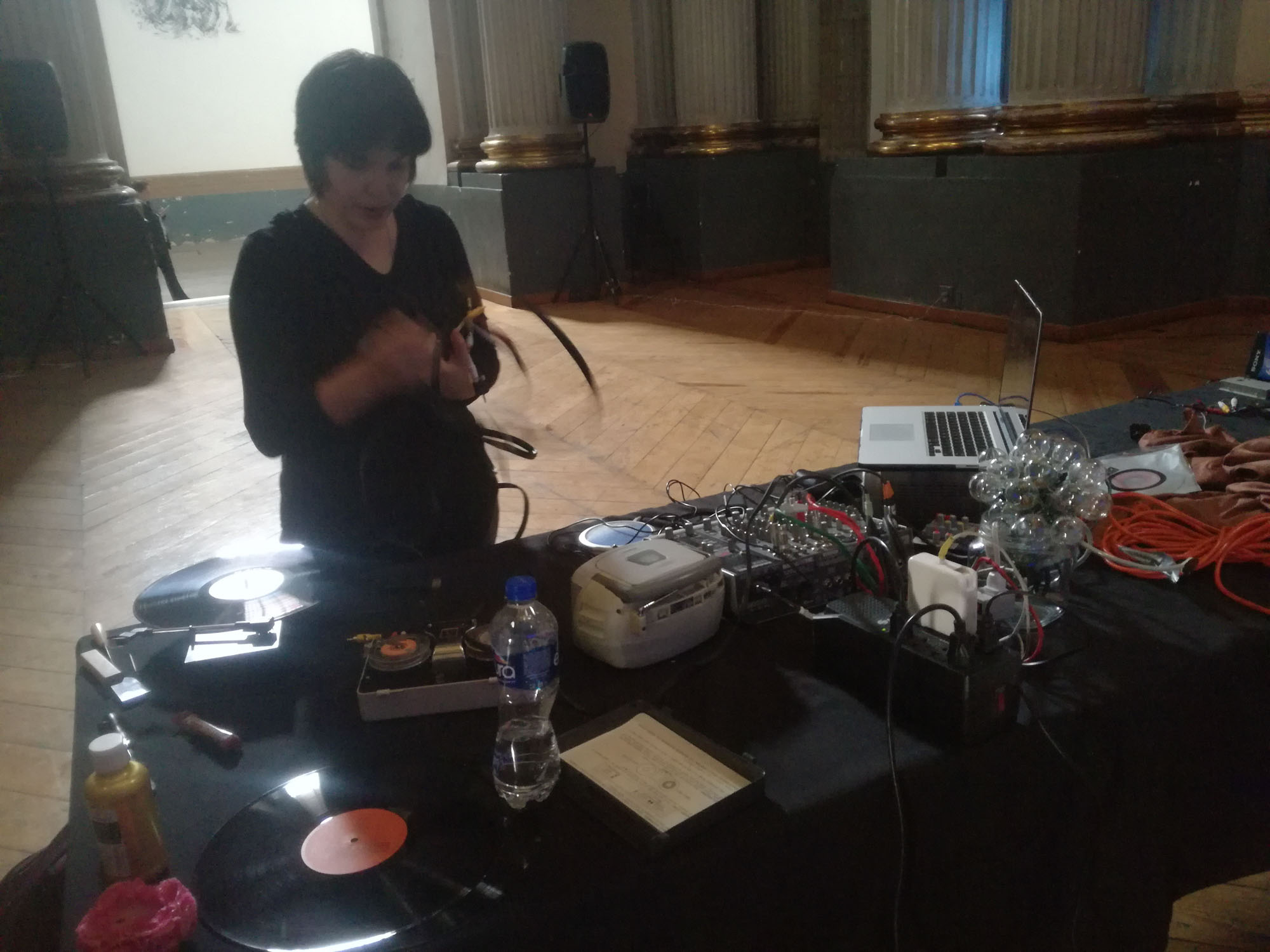 A este desastre intencionado se sumó la exploración sonora de Escobar, quien a partir de registros de conferencias y otros audios de archivo, tejió la base de un ejercicio de improvisación lúdica que sumando la voz, y objetos de uso cotidiano como bombillas de luz y discos de acetato, transformó la dimensión sonora en una experiencia sensorial que reverberó materialmente en la audiencia participante.